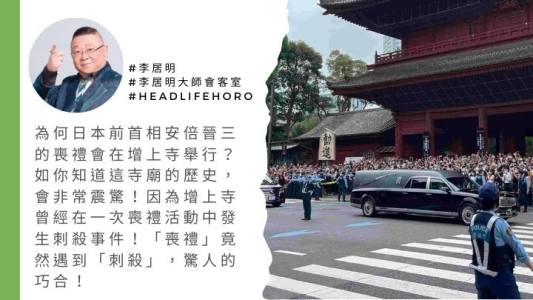 日本前首相安倍晉三上周遇刺身亡,其喪禮在東京增上寺舉行。我的禮佛團曾經到訪過「增上寺」,印象很深。這所寺廟最著名的是可望見東京鐵塔,紅、白相間的地標極為注目。我當時對團友說,這所寺廟很容易發生火災,因為鐵塔代表「火」,如果流年飛來九紫或七赤,「九七同宮」應回祿之災,多年前此地真的發生火災。