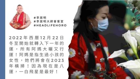 但是,到了2023年,其實由2022年西曆12月22日冬至開始就轉入下一年的運。所有阿媽大晒又行運!阿媽是指生過小孩的女性,她們將會在2023年橫掃!因為現在是八運,一白飛星是最好!