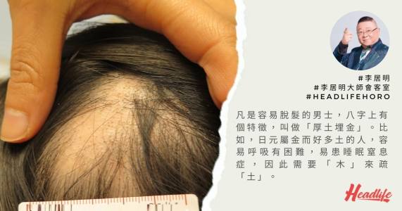 凡是容易脫髮的男士,八字上有個特徵,叫做「厚土埋金」。比如,日元屬金而好多土的人,容易呼吸有困難,易患睡眠窒息症,因此需要「木」來疏「土」,很飢餓「木」來救,於是只好犧牲頭髮,造成脫髮。「厚土埋金」亦是生雀斑的淵源。