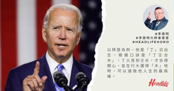 以拜登為例,他是「丁」日出生,根據口訣是「丁壬合木」,丁火見到壬水,才合得開心,並在行大運得「木」地時,可以達致他人生的最高峰。
