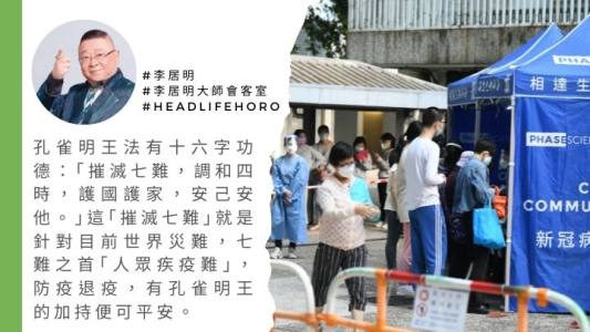 根據佛經,孔雀明王法有十六字功德:「摧滅七難,調和四時,護國護家,安己安他。」這「摧滅七難」就是針對目前世界的災難,七難之首「人眾疾疫難」,防疫退疫,有孔雀明王的加持便可平安。「調和四時」是指風調雨順,沒有天災。「護國護家」是指修持孔雀明王法可以護國,不會受他國侵逼,護家令家人和合,不會離棄。「安己安他」,令自己和他人都得安詳自在,這十六個字,是目前香港、全球都很需要的。