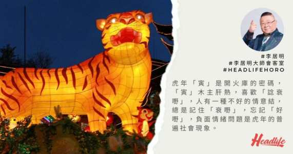 虎年「寅」是開火庫的密碼,「寅」木主肝熱,喜歡「諗衰嘢」,人有一種不好的情意結,總是記住「衰嘢」,忘記「好嘢」,負面情緒問題是虎年的普遍社會現象。事實上,虎年每個人都需要宗教,需要得到心靈的安慰,當你遇到任何不如意的事,記住我的八字真言:「一念天堂,一念地獄」。