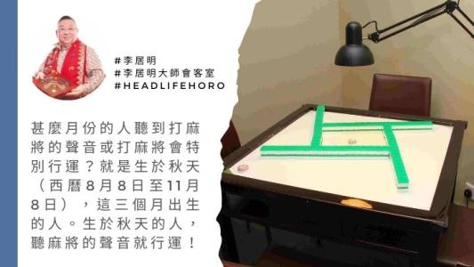 甚麼月份的人聽到打麻將的聲音或打麻將會特別行運?就是生於秋天(西曆8月8日至11月8日),這三個月出生的人。生於秋天的人,聽麻將的聲音就行運!打麻將這活動是屬「亥」水,水木的長生。要木的人,聽到一些打麻將的聲音就不是聲煞了。麻將有個很大的功能,就是會加強我們身體的木旺。木旺的人手腳比較精靈,坐很久雙腳都沒有事,所以老人家打麻將是一種不錯的養生活動。其實,現代人打麻將即等於古代人讀書,讀書屬木,打麻將又屬木,都是文昌活動,甚至寫書法、畫畫都是屬於水木活動。