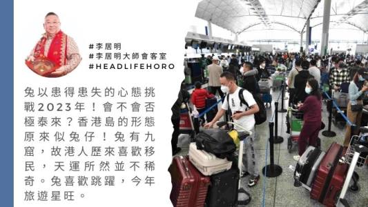先講兔,過去兩年運程沉悶,明年值太歲。兔以患得患失的心態挑戰2023年,會不會否極泰來?你知道嗎?香港島的形態原來似兔仔,兔有九窟,故港人歷來喜歡移民,天運所然並不稀奇。兔喜歡跳躍,今年港人旅遊星旺。
