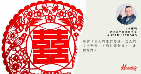 所謂「男人冇妻冇發達,女人冇夫不矜貴」,男性要發達,一定要結婚。女性有夫星才顯貴,想有人寵錫,一定要結婚!