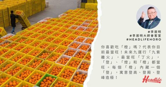 你喜歡吃「橙」嗎?代表你目前最當旺!未來九運行「九紫離火」,最當旺 「丁火」,「登」、「燈」和「橙」都當旺。每一個「橙」內藏著一個「登」,寓意登高、登殿、登峰造極,所以「橙」是九運的當旺水果! 香港人喜歡吃「金山橙」,除了有金山的意頭,「橙」也是代表成功之意!「橙」內含有豐富的維他命C,既健康又行運!聽自然療法的專家說,維他命C可減壓及吃掉身上的壞細胞!