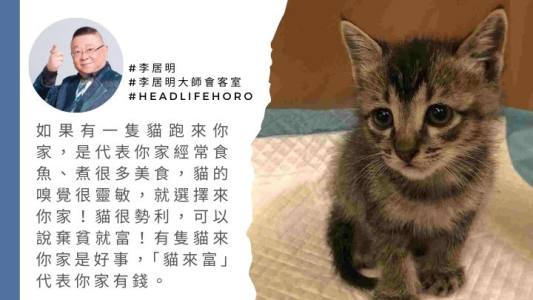 如果有一隻貓跑來你家,是代表你很喜歡吃魚!因為貓是聞到魚味就會來你家!這是自來貓的特色。你家經常食魚、煮很多美食,貓的嗅覺很靈敏,就選擇來你家!如果你家很少買食物,沒有食物的香味,就吸引不到自來貓!所以,貓很勢利,可以說棄貧就富!由此可知有隻貓來你家是好事,「貓來富」代表你家有錢。