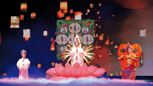 ◄《金玉觀世音》由藍天佑、鄭雅琪擔演,唱造唸打、靚衫靚景賞心悅目,是視覺聽覺的至高享受。人生哲思發人深省。觀音成佛背景中的密宗曼荼羅代表輪圓具足,和諧幸福的宇宙智慧。