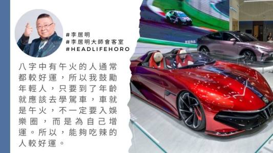 八字中有午火的人通常都較好運。所以我鼓勵年輕人,只要到了年齡就應該去學駕車,車就是午火,不一定要入娛樂圈,而是為自己增運。所以,能夠吃辣的人較好運。