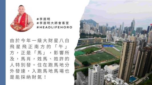 由於今年一級大財星八白飛星飛正南方的「午」方,正是「馬」,影響所及,馬肖,姓馬、姓許的人特別發,生於西曆6月6日至7月6日午月的人也特別發。