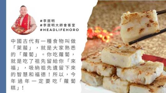 逢祖先留給你遺產,叫做「來福」。中國古代有一種食物叫做「萊菔」,就是大家熟悉的「蘿蔔」。你吃蘿蔔,就是吃了祖先留給你「來福」,吸納祖先遺留下來的智慧和福德!所以,今年過年一定要吃「蘿蔔糕」!