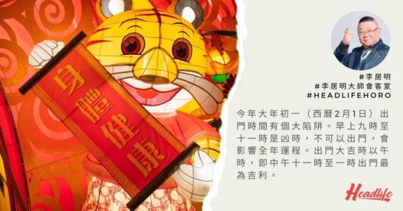 今年大年初一(西曆2月1日)出門時間有個大陷阱。早上九時至十一時是凶時,不可以出門,會影響全年運程。出門大吉時以午時,即中午十一時至一時出門最為吉利。或者用早一點的辰時,即早上七時至九時出門。如果不準備出門拜年,也要開一開大門,接接旺氣。今年出門方向以東北方最為吉利。切忌向西南方!