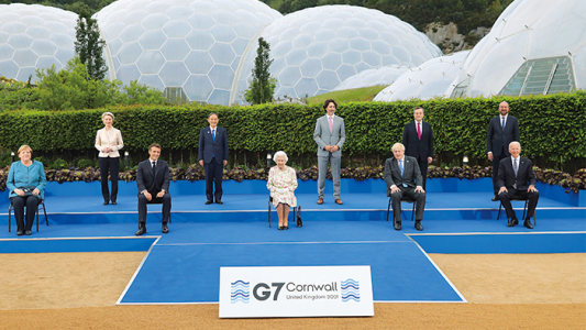 G7七國領袖和英女皇拍照,英女皇坐在中間,左右兩旁分別是首相約翰遜和法國總統馬克龍,而美國總統拜登竟然被安排「靠邊坐」,坐在左方最側邊的位置,很明顯美國失去往昔的霸權地位,美國國運已下跌,我曾預測二○二一年六月開始「美國國運走上衰退之始」,由這張相片作出一個很明顯的標記。