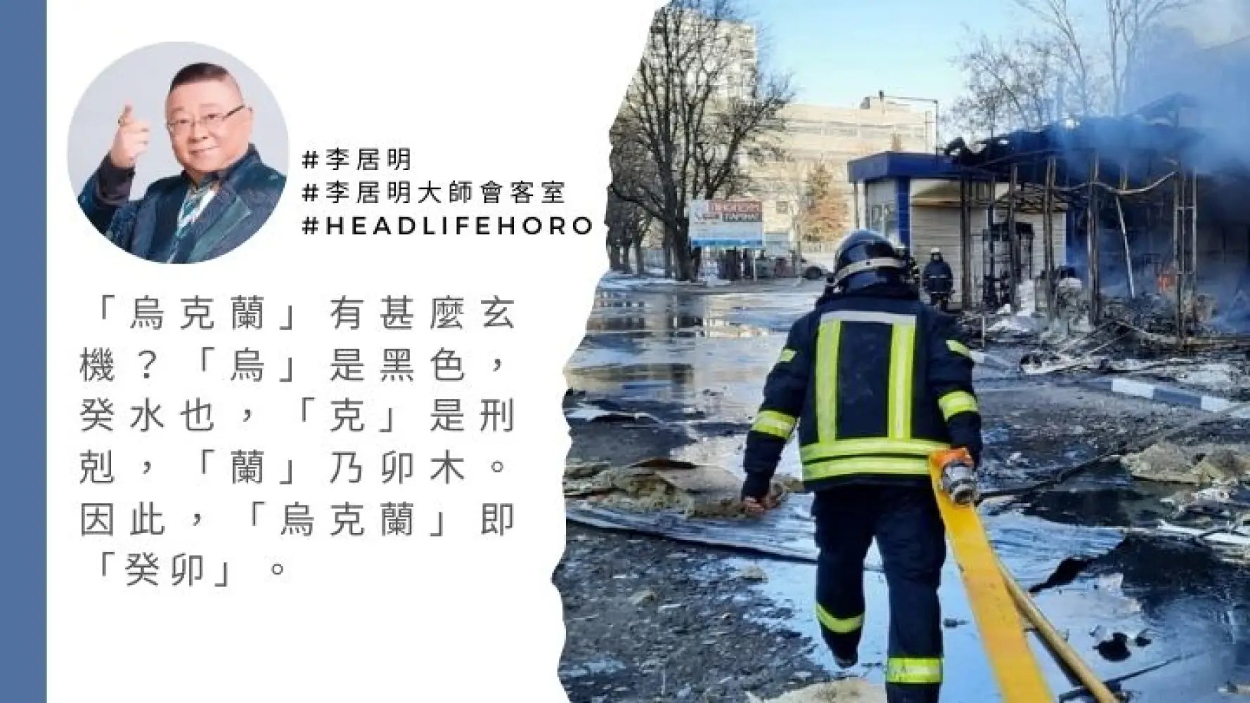 我嘗試從玄學角度為大家分析俄烏局勢。首先,「烏克蘭」有甚麼玄機?「烏」是黑色,癸水也,「克」是刑剋,「蘭」乃卯木。因此,「烏克蘭」即「癸卯」。三月份正是癸卯月,即太歲月,特別多事。八字上,你是乙卯木,你的敵人就是甲寅木。所以,俄羅斯應該是甲木。