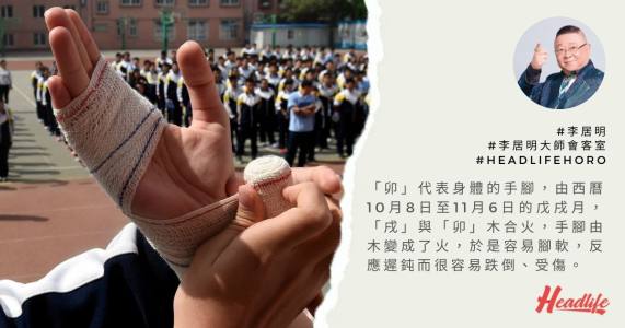 「卯」代表身體的手腳,由西曆10月8日至11月6日的戊戌月,「戌」與「卯」木合火,手腳由木變成了火,於是容易腳軟,反應遲鈍而很容易跌倒、受傷。而到了西曆11月7日至12月6日的己亥月,「亥」是大驛馬,代表更容易跌倒。我教大家在家中用水養四枝富貴竹來補木,有「粉絲」家中的富貴竹竟然斷了一枝,證明避過一劫,不用跌倒,富貴竹功勞不小。