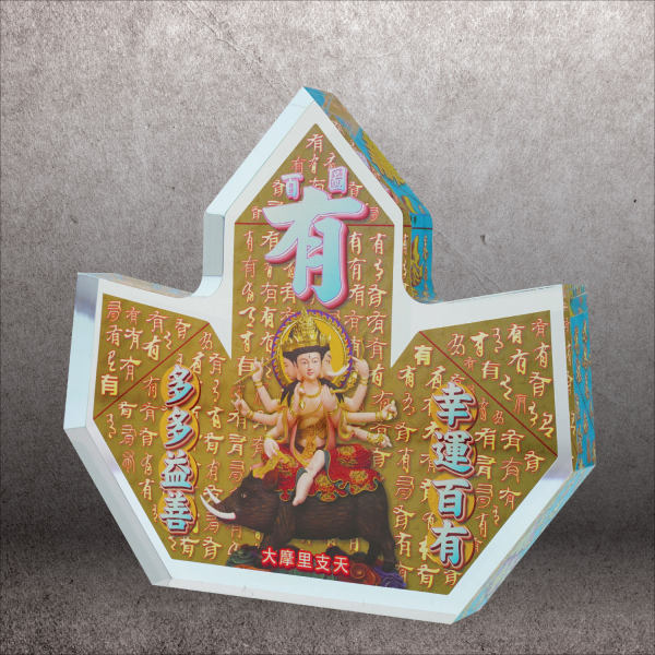 - 「百有圖」守護本尊為密宗「大摩里支天」,不但加持眾生獲得百戰百勝,又能消除百種劫難,令眾生獲得財富之際亦無後顧之憂,用上「摩里支天九字切」圖騰令此牌功力更勝一籌。再加上「光明加持」「百無禁忌」八字對聯,任何陰性磁場都得到清淨,可謂是獨一無二的「密宗鎮宅圖」。