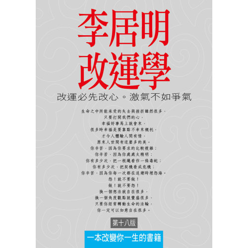 這是大師傳世的代表作,全書講述改運必先改心的秘訣,分十章詳述,從一天的改運技術到改運三十心法,嘉言雋語到新的一年改運技法一百零八智慧存摺。是你一生必看的加油書。